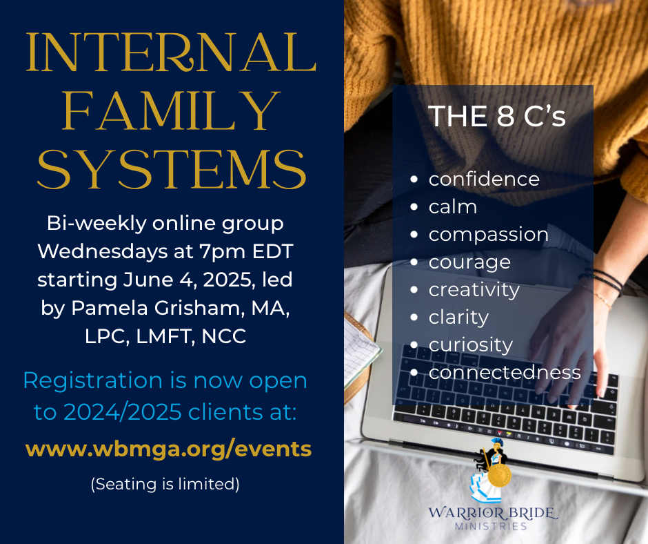 Internal Family Systems is a bi-weekly online group led by Pamela Grisham, MA, LPC, LMFT, NCC that combines biblical principles with the tools of IFS. As we explore the 8 C’s, we will focus on gaining access and brining healing to the protective and wounded inner parts of ourselves.
